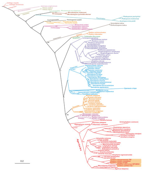 Subsequently, we performed maximum likelihood (ML) and Bayesian inference (BI) analysis on the integrated protein sequence dataset (fourteen conserved PCGs), resulting in two phylogenetic trees with consistent and well-supported topologies (Figure 11). The 111 Agaricomycetes species formed 17 major clades of the orders Agaricales, Boletales, Russulales, Polyporales, Hymenochaetales, Phallales, Gomphales, Sebacinales, Cantharellales, Tremellales, Trichosporonales, Pucciniales, Microbotryales, Sporidiobolales, Tilletiales, Microstromatales, and Ustilaginales (Table S13). The 34 Agaricales mushrooms were separated into 15 families: Pleurotaceae, Lyophyllaceae, Pluteaceae, Tricholomataceae, Agaricaceae, Hydnangiaceae, Physalacriaceae, Omphalotaceae, Marasmiaceae, Schizophyllaceae, Agaricomycetidae, Hygrophoraceae, Amanitaceae, and Strophariaceae. Moreover, the phylogenetic tree indicated a close relationship between Cyathus and the Laccaria genus (Hydnangiaceae).