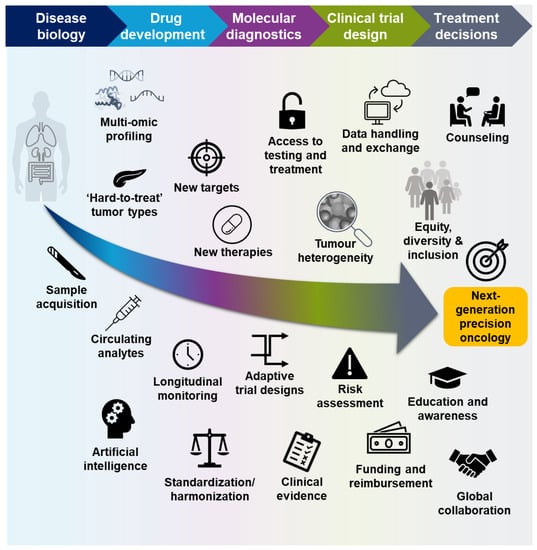Recent developments in molecular technologies have enabled the ever more precise and complex characterization of human cancers, while identification of novel targets have, for some patients, delivered of the promise of precision oncology, showing improved response rates while mitigating safety concerns. There is, however, some way to go on the journey to accessible precision medicine for all patients with cancer []. Global collaboration is required to establish standardized experimental and reporting methods, as well as clinically relevant cutoffs in biomarker analyses, reducing the noise in data derived from different clinical studies [,]. Intelligent approaches to molecular profiling are also required. While comprehensive multi-omic profiling of all patients may one day be a possibility, many are likely to be irrelevant or impractical in a real-world setting, and it is important to ensure that patients undergo the right test for the right biomarkers at the right time. Further efforts are required to ensure that representative molecular datasets are available for all patient populations, that all patients have access to appropriate molecular testing, and that novel targeted approaches are identified for “hard-to-treat” tumor types []. Ongoing interdisciplinary communication is needed between product developers, molecular and cell biologists, pathologists, oncologists, governing bodies, and payers, as well as patients and their families, and this can only be achieved with improved awareness and literacy around molecular methods and their applications []. It is important to remember that all parties are aware of the strengths and limitations of molecular testing, and that appropriate counseling is available to guide patients and their families through their journey []. Finally, we must not forget that ethical guidelines must evolve at the same pace as technological advances, to ensure patient safety and privacy [,]. If these challenges are addressed appropriately to inform drug discovery, disease diagnosis, and treatment decisions, improved precision oncology will be made available for a wide range of patients with cancer.