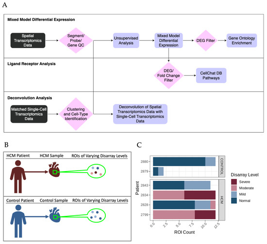 Raw expression data from ROIs underwent quality control and Q3 normalization per the recommendations from the manufacturer (nanoString). Segment, probe, and gene quality control were performed using the R package, GeoMXTools v2.99.2. The expressed genes were filtered for inclusion in at least 1% of segments. Samples that passed quality control underwent unsupervised analysis to identify potential confounding factors. Linear mixed-effects models were used to test for differential gene expression between groups of ROIs with different levels of disarray and HCM status using a composite variable indicating HCM status and disarray level as a fixed effect and setting the patient identifier as the random effect. Genes with Benjamini–Hochberg adjusted p-values of less than 0.05 were considered significantly differently expressed between groups of ROIs. Gene Ontology analysis was performed using the R package, ClusterProfiler, using all three GO ontologies [31,32].