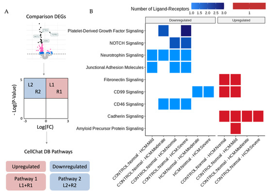 The bioinformatic analysis pipeline for the identification of Ligand–Receptor (L–R) pairs that are differentially expressed in areas of myocyte disarray is shown schematically in Figure 2A and further explained in Figure 4A. Differentially expressed genes were determined in pairwise comparisons between ROIs classified by the degree of myocyte disarray and overall patient HCM status, as described above. The gene sets from each comparison were separated by whether they were down or upregulated. The gene sets were then compared to the CellChat Interaction Database [7] to identify Ligand–Receptor pairs that were both present in either the up or downregulated gene sets and which pathway the Ligand–Receptor pair was associated with (Supplemental Table S2). Here, we note that, like the differential expression results, significant Ligand–Receptor pairs are observed when comparing ROIs obtained from HCM patients with varying levels of disarray to ROIs obtained from control patients. Although the GO enrichment analysis of the DEGs between control normal ROIs and HCM ROIs with varying levels of disarray did not uncover differences in GO terms, there were differences in the CellChat pathways associated with significant ligand–receptor DEG pairs. In HCM patients, compared to the control patients, normal disarray areas show a downregulation of CD46, junctional adhesion molecule, neurotrophin, and NOTCH signaling, while cadherin, CD99 and fibronectin signaling are upregulated. Areas of mild disarray in HCM patients are downregulated for junctional adhesion molecule and neurotrophin signaling and upregulated for cadherin, CD99, fibronectin and amyloid precursor protein signaling compared to normal disarray areas in control patients. Moderate disarray areas in HCM patients are downregulated for CD46, neurotrophin, and platelet-derived growth factor signaling and upregulated for cadherin signaling compared to normal disarray areas in control patients. Severe disarray areas in HCM patients are downregulated for CD46, junctional adhesion molecule, neurotrophin, NOTCH, and platelet-derived growth factor signaling and upregulated for cadherin signaling compared to normal disarray areas in control patients. Interestingly, CD99 signaling is upregulated in the HCM normal/mild ROIs compared to the control normal ROIs but downregulated in the HCM moderate/severe ROIs compared to the HCM normal ROIs. Also, JUN kinase signaling is upregulated in areas of severe disarray compared to areas of moderate disarray. The greatest number of Ligand–Receptor pairs driving these pathways is observed in platelet-derived growth factor signaling, followed by NOTCH signaling. All other pathways have one Ligand–Receptor pair per disarray level comparison.