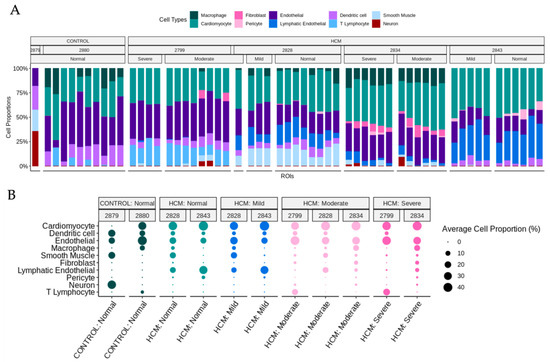 We also assessed whether cell-type diversity differed between the ROI from the control and HCM patients using the cell-type diversity statistic described by Karagiannis et al. [10]. Although there is a trend towards higher cell-type diversity in HCM patients compared to control patients, the results were not statistically significant at the p < 0.05 level when accounting for inter-patient variability via a linear mixed-effect model (Supplemental Figure S3A).