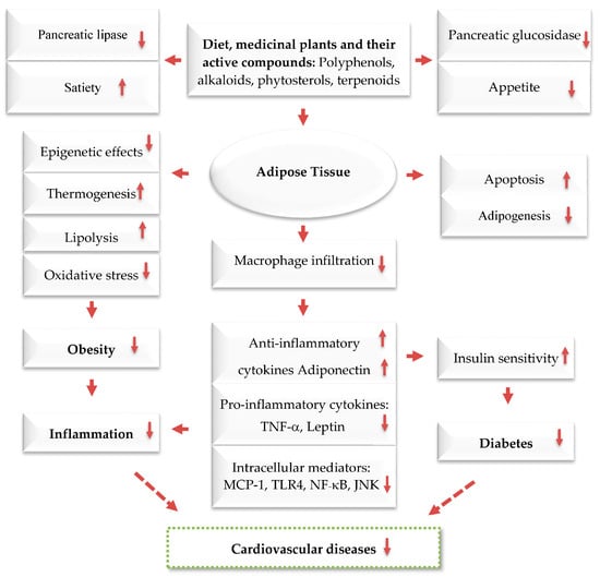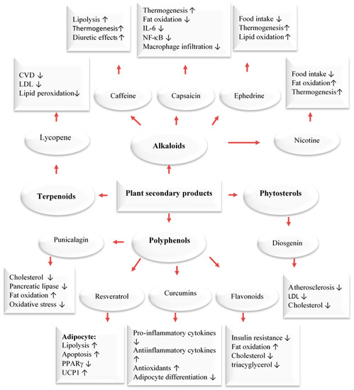 Major classes of plant secondary metabolites and their anti-obesity mechanisms [39]. Upwards: Activation; downwards arrows: Inhibition.