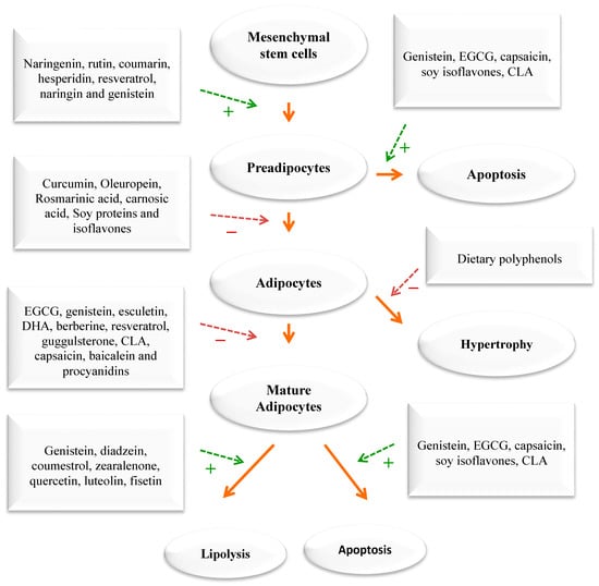 The impact of phytochemicals on adipogenesis. Green dashed arrows: Activation; red dashed arrows: Inhibition.