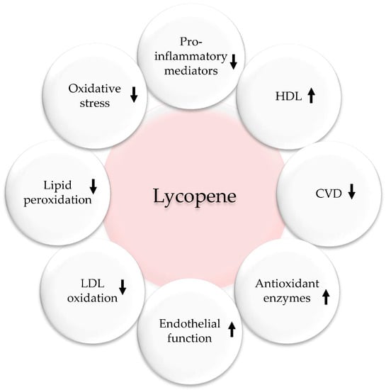 Antioxidant, anti-inflammatory, and cardiovascular effects of lycopene. Upwards arrows: Activation; downwards arrows: Inhibition.
