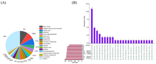 Classifications of DH extracts from different extracted fractions. (A) The compound types identified in 11 fractions from DH; (B) The UpSet diagram of 11 fractions from DH. DF: Dichloromethane fraction; EF: ethyl acetate fraction; BF: n-butanol fraction; WF: water fraction; CF: crude fraction; 0~100%: 0%, 20%, 40%, 60%, 80%, or 100% ethanol macroporous absorption resin. Each dop represents a chemical compound.