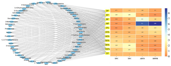 The heat map analysis was drawn using the website (http://www.bioinformatics.com.cn/plot_basic_matrix_heatmap_064, accessed on 20 July 2023), and the CF value was used as a comparison with a value of 1 for the different group values of the TFC, TPC, and IC50 values of ABTS and DPPH. The bioactivities of various chemical constituents in the DH fractions (DF, EF, and 60%, 80%, 100% fractions) were explored using the Collection of Open Natural Products (COCONUT) database (https://coconut.naturalproducts.net/, accessed on 12 April 2023). The chemical component analysis in different polar fractions of DH and the network diagram of these chemical constituents and their bioactivities were also performed in this study.