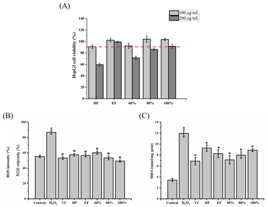 The effect of DH fractions on the viability of HepG2 cells and ROS and MDA accumulation in H2O2-induced HepG2 cells. (A) The viability of HepG2 cells; (B) intracellular ROS content; (C) MDA content. ROS: Reactive oxygen species; MDA: malondialdehyde; DF: dichloromethane fraction; EF: ethyl acetate fraction; 60~100%: 60%, 80%, or 100% ethanol macroporous absorption resin; VC: vitamin C. “#” represents significance between control group and H2O2 group (p < 0.05); “*” represents significance between H2O2 and sample groups (p < 0.05). The red dotted line in (A) represents that the cell viability was more than 90%. The error bar represents a standard deviation.