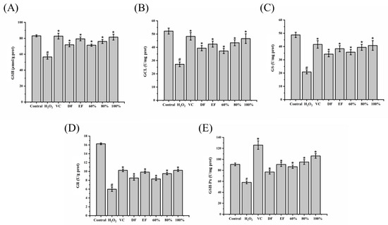 GSH is the most abundant antioxidant, and it is important throughout the body [22,23,24]. It is an effective strategy to increase antioxidative ability by promoting the synthesis and metabolism of GSH. Hence, the activities of glutamic acid cysteine ligase (GCL), glutathione synthetase (GS), glutathione peroxidase (GSH-Px), glutathione reductase (GR), and the GSH level were determined in this study. As shown in Figure 3, the H2O2 treatment sharply decreased the GSH content and the activities of GCL, GS, GR, and GSH-Px by 31.85%, 47.96%, 57.23%, 63.22%, and 35.99%, respectively. Fortunately, upon pretreatment with DF, EF, and 60%, 80%, 100% ethanol fractions, the GSH contents (Figure 4A) were significantly increased by 26.89%, 40.05%, 26.10%, 34.24%, and 43.85% (p < 0.05), respectively. Similarly, the activities of antioxidative enzymes GCL (Figure 4B), GS (Figure 4C), GR (Figure 4D), and GSH-Px (Figure 4E) were markedly enhanced by pretreatment with these DH fractions. In particular, EF exerted a better antioxidative effect than DF on activating the oxidation–reduction cycle of GSH, while the 100% ethanol fraction exhibited the highest effect on GSH synthesis and metabolism, which was close to the VC group.