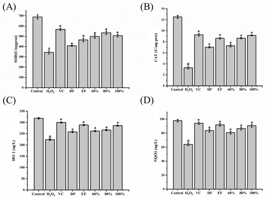 The antioxidative enzyme system, consisting of SOD, CAT, HO-1, NQO1, and so on, is responsible for the protection of organisms against oxidative stress [22,25]. Hence, improving the activities of antioxidative enzymes is an effective strategy for decreasing the accumulations of ROS and MDA. The present results (Figure 5) revealed that DH fractions (DF, EF, and 60%, 80%, 100% ethanol-aqueous fractions) effectively reversed the decreasing activities of SOD (Figure 5A), CAT (Figure 5B), HO-1 (Figure 5C), and NQO1 (Figure 5D) induced by H2O2 in HepG2 cells (p < 0.05). In particular, the EF and 80% and 100% ethanol-aqueous fractions enhanced the activities of these antioxidative enzymes. This finding supported that these five DH fractions could reduce ROS and MDA accumulations by increasing the activities of SOD, CAT, HO-1, and NQO1.