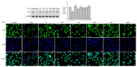 Nrf2 is a very important antioxidative regulator that can transfer from cytoplasm to the cell nucleus to bind with the antioxidant response element (ARE), which then initiates the transcription of antioxidative enzymes [25]. Thereby, the total Nrf2 protein expression was determined by Western blotting, and the nuclear protein expression of Nrf2 was observed by fluorescence staining. The result (Figure 6A) showed that H2O2 markedly reduced total Nrf2 expression in comparison with the control group by 38.93% (p < 0.05). A significant finding was that the pretreatments with DF, EF, and 60%, 80% and 100% ethanol-aqueous fractions caused a dramatic increase in total Nrf2 protein expressions by 40.03%, 69.52%, 54.49%, 62.38%, and 77.98%, respectively. The 4′,6-diamidino-2-phenylindole (DAPI) staining result (Figure 6B) showed that the nuclear Nrf2 expression was also increased by DH fractions, especially in EF and the 80% and 100% ethanol-aqueous fraction groups. These results demonstrated that DH fractions could increase the total Nrf2 protein levels and expressions of nuclear Nrf2 protein.