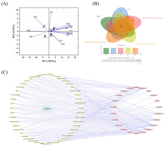 Multivariate analysis and pharmacologic compound network analysis of DH fractions on antioxidative indexes or bioactivities. (A) Results of principal component analysis (PCA); (B) Venn diagram of DH fractions; (C) network between chemical constituents of DH fractions and bioactivities. PCA: principal component analysis; DF: dichloromethane fraction; EF: ethyl acetate fraction; BF: n-butanol fraction; WF: water fraction; CF: crude fraction; 0~100%: 0%, 20%, 40%, 60%, 80%, or 100% ethanol-aqueous macroporous absorption resin.