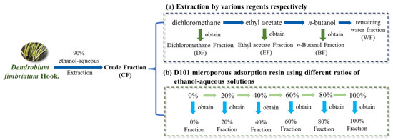 The stems of Dendrobium fimbriatum were collected from Baoshan city in Yunnan Province of China. The samples were freeze-dried by a lyophilizer, crushed, and then extracted by 90% ethanol-aqueous solution using ultrasonic assistance extraction method three times. After centrifugation, the supernatant was collected for concentration using a rotary evaporator (Heidolph, Schwabach, Germany) to obtain the crude extract (CF). The CF was further fractionated by two methods as follows (Figure 8):