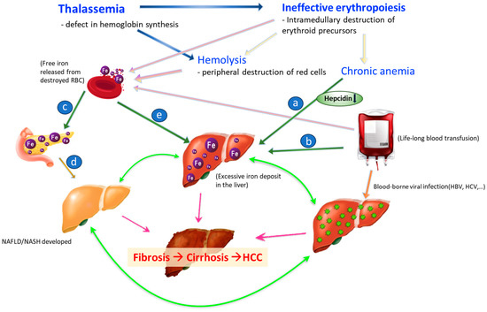 Thalassemia is a heterogeneous congenital hemoglobinopathy common in the Mediterranean region, Middle East, Indian subcontinent, and Southeast Asia [1,2,3,4]. Immigration has led to the gradual increase in the incidence of thalassemia in Northern Europe and North America [5,6]. Thalassemia can be classified based on defects in the globin chain, the α-globin chain or β-globin chain as α-thalassemia or β-thalassemia, respectively. Thalassemia is the most common monogenic disease worldwide, with approximately 1.5% of the population carrying the β-thalassemia allele and 5% carrying the α-thalassemia allele [5,7]. Clinical manifestations include anemia, jaundice, and iron overload, and the disease severity ranges from near-normal without complications to requiring lifelong transfusion support [3,6]. Patients with thalassemia requiring transfusion support are classified into transfusion-dependent thalassemia (TDT) and non-transfusion-dependent thalassemia (NTDT) based on the frequency and regularity required. The lifespan will be less than 10–15 years without transfusions, and with transfusion therapy, it can be extended to approximately 50 years depending on the management of the iron overloading resulting from repeated red cell transfusions, which damage organ functions, especially the heart, liver, lung, pancreas, and pituitary glands [3,8,9]. Besides transfusions, increased dietary iron absorption is one of the major causes of liver iron overloading, typically in patients with NTDT [6,8]. Liver iron deposits lead to liver fibrosis, cirrhosis, and HCC [8]. The relationship between iron overload and HCC development is clear in that the incidence of HCC is much higher in patients with hereditary iron overload than in the general population [10]. A prospective study found that the incidence of HCC in patients with a beta-thalassemia major was approximately the same as the risk for HCC in the general population but with a significantly younger age at HCC diagnosis [11]. The incidence of HCC in patients with thalassemia has increased over time as better chelation therapy confers a sufficiently long lifespan for HCC development [12]. According to an analysis based on the Taiwan Health Insurance Longitudinal Database (1998–2010), patients with thalassemia had a significantly higher risk for abdominal cancer (aHR = 1.96, 95% CI 1.22–3.15) compared with the comparison group. Patients with thalassemia who received blood transfusions were 9.12 times more likely to develop abdominal cancer than those who did not receive blood transfusions [13]. Iron accumulation can also lead to various endocrinopathies, such as hypogonadism, impaired pancreatic excrete function, and hypothyroidism [14]. This review discusses the pathogenesis, molecular mechanisms, management, and perspectives of iron overloading associated with HCC in patients with thalassemia.