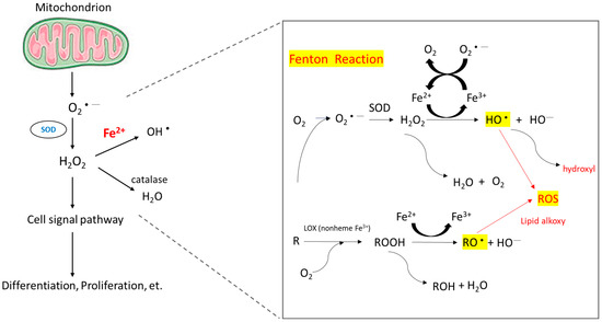 Mechanism of ROS accumulation caused by the Fenton reaction. The reaction of peroxides with Fe2+ to yield soluble hydroxyl (HO•) or lipid alkoxy (RO•) radicals is referred to as the Fenton reaction.