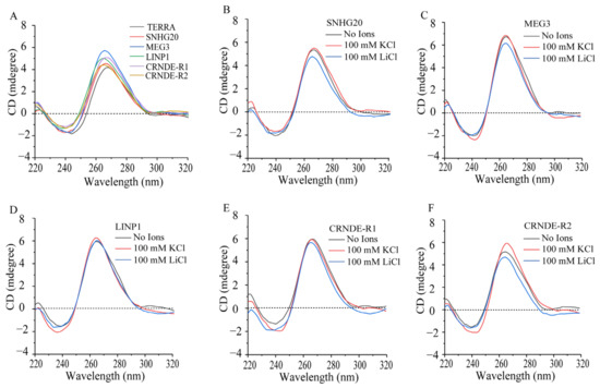 (A) Comparative CD spectra from PQS of lncRNA oligonucleotides (5 µM). CD spectra of lncRNAs (A) TERRA, (B) SNHG20, (C) MEG3, (D) LINP1, (E) CRNDE-R1, (F) CRNDE-R2, in the presence and absence of monovalent cations K+ (100 mM) and Li+ (100 mM). Samples were prepared in G4-folding buffer as described in Section 4.