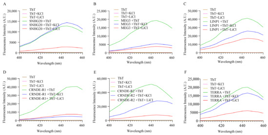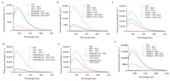 Emission spectra of (A) SNHG20, (B) MEG3, (C) LINP1, (D) CRNDE-R1, (E) CRNDE-R2 and (F) TERRA in the presence and absence of K+ and Li+ and ThT (2 µM) when excited at 445 nm.