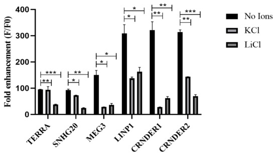 Fold enhancement of ThT fluorescence for lncRNAs in the presence and absence of monovalent cations, with excitation and emission at 445 and 488, respectively. Data expressed as mean ± SEM. * p ≤ 0.05; ** p ≤ 0.001, *** p ≤ 0.0001.