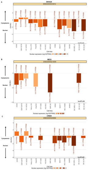 Subcellular localization of lncRNAs as obtained from lncATLAS database for (A) SNHG20, (B) MEG3 and (C) CRNDE.