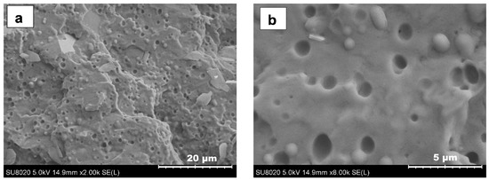 To obtain more insight into the morphology of the polymer matrix used in this study, SEM analyses (in SE mode) have been performed on the impact fractured surfaces of unfilled PPc samples (Figure 1a,b). The presence on the fractured surfaces of microscopic nodules of EPR and of circular micro-voids (mean dimension around 1.1 µm) formed after the removal or debonding of EPR from the iPP matrix is clearly revealed by the SEM micrographs. Interestingly, the EPR nodules are uniformly dispersed through the iPP matrix and, accordingly, will play a key role in increasing the impact strength, as confirmed by mechanical characterizations. Indeed, it was reported that the dispersed rubber particles from the PPc could deform in a ductile manner during mechanical solicitations and/or generate crazes that absorb the impact energy, preventing the growth of catastrophic cracks [49]. It is worth pointing out the additional presence of some platelet-like structures visible in SEM pictures (Figure 1a), which can be reasonably attributed to the presence of specific additives used by the supplier to modify PPc, e.g., nucleating agents (NAs).