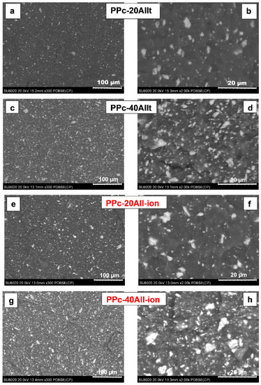 (a–h). Representative SEM micrographs (BSE mode) at different magnifications on the cryo-fractured surfaces of PPc composites: (a,b) PPc–20AIIt and (c,d) PPc–40AIIt composites; (e,f) PPc–20AII-ion and (g,h) PPc–40AII-ion composites.