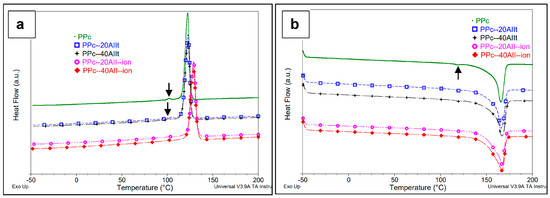 To be complete, one can also observe a very small exothermal peak at ca. 102 °C, which is more readily visible for the unfilled PPc and PPc–AIIt composites (as highlighted by black arrows in Figure 5), which is ascribed to the presence of some crystallizable component from the heterophasic PPc, such as the crystallization of PE-rich sequences of low molecular weights [15] (Tm at 118 °C in the second DSC heating), or to the crystallization of some EPR components [49]. However, it is not totally excluded that this can be accounted for processing additives as well. From the second DSC heating scans (Figure 5b), only minor changes in Tm (165–167 °C) are observed, whereas by comparing the enthalpies of melting and the degree of crystallinity (Table 4), they are somewhat higher in the case of composites with respect to the unfilled (nucleated) PPc.