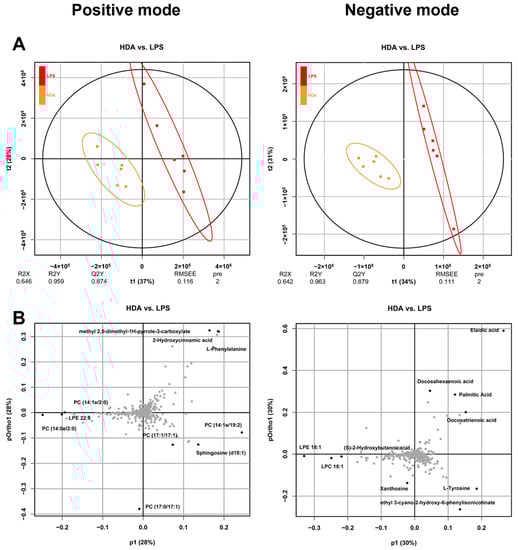 Multivariate analyses of metabolites in RAW 264.7 cells. (A) PLS-DA score plots of metabolite profiling data showing different clusters in positive and negative ion mode. Red spots indicate LPS-induced cell groups (LPS), yellow spots indicate 10-HDA-treated cell groups (HDA); (B) loading plots representing influential metabolites in the HDA-treated and LPS-stimulated groups under positive and negative ion mode.