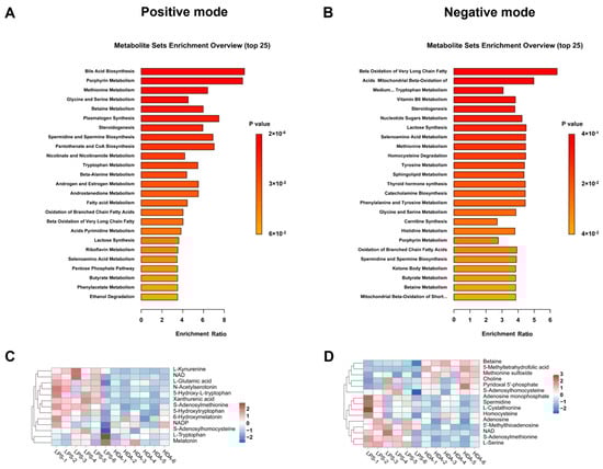 Analyses of HDA-treated group and LPS-stimulated group based on metabolomics. Metabolites set enrichment analysis for pathway over-representation in (A) positive and (B) negative ion modes. Hierarchical clustering analysis of metabolites associated with (C) methionine and (D) tryptophan metabolism.