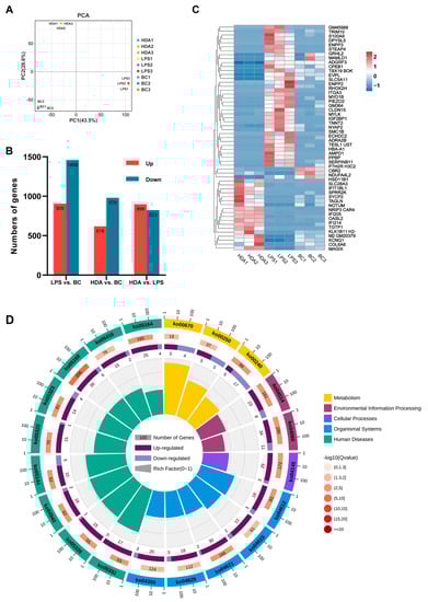 Identification and enrichment of coding transcripts (mRNA) expression. (A) PCA plot of all sample transcriptomes under the HDA, LPS treatments, and the control; (B) differential expressed genes statistics in macrophages with different treatments; (C) heatmap visualization of differentially expressed genes between the LPS and HDA groups (|fold change| ≥ 5) and the levels of the corresponding genes in the BC group; (D) KEGG pathway annotation of the DEGs between the LPS and HDA groups.