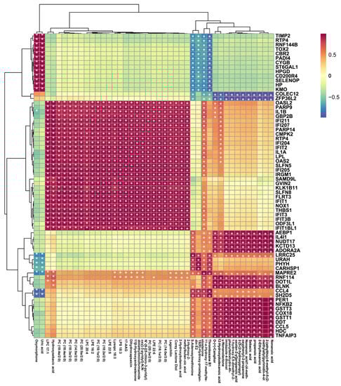 Heatmap map of correlation between DEG and DEM abundance. The asterisk indicates significant correlation, * p < 0.05.