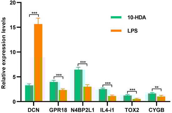 To validate the RNA-seq results, three random DEGs (DCN, GPR18, and N4BP2L1) in differential analysis and three key genes (IL4-i1, TOX2, and CYGB) in correlation analysis were subjected to qPCR. As shown in Figure 5, N4BP2L1, GPR18, IL4-i1, CYGB, and TOX2 demonstrated significantly higher expression in HDA-treated cells than in LPS-induced cells, and the expression level of DCN significantly decreased with HDA treatment, which was consistent with the RNA-seq data. These results indicated that the RNA-seq data for the mRNAs were reliable.