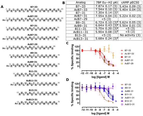 H2 relaxin and RXFP1 have been extensively studied through Structure Activity Relationship (SAR) studies, and the key residues for relaxin binding to the LRRs are RB13, RB17, and IB20 (Figure 2) [,]. In our earlier publication on B7-33, we explored the effect of R13A, R17A, and I20A mutations on binding to the native RXFP1 receptor, which showed that loss of any of these key residues abolished the binding to RXFP1 within the limits tested []. Here, we analyzed the effect of these same mutations in B7-33 in our HEK-7BP competitive binding assay (Figure 2C). AcB7-33 was selected as the scaffold for this test as N-terminal acetylation has the potential advantage of providing stability against aminopeptidases. The binding data for these analogs confirm the important role that R13, R17, and I20 (RB13, RB17, and IB20 in the native two-chain H2 relaxin) play in the binding affinity to the RXFP1 ectodomain. The alanine-substituted B7-33 variants highlight the utility of the HEK-7BP competitive binding assay to resolve B7-33 analog binding affinity changes.