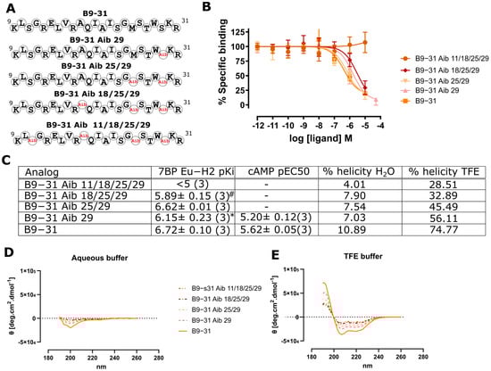 Aib incorporation into B9-31. (A) position of Aib incorporation into B9-31 (red). (B) 7BP competitive binding assays on analogs. (C) The effect of Aib incorporation on Eu-H2 relaxin binding affinity pKi (from (B)) and cAMP potency pEC50 (from Figure S2). Analog helicity in (D) aqueous and (E) TFE-containing phosphate buffers. * p < 0.01 vs. B9-31 and # p < 0.001 vs. B9-31.