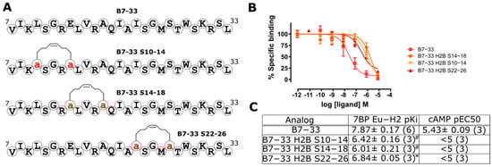 HC-stapled B7-33 analogs. (A) Sequences of HC-stapled B7-33 analogs with positions of (S)-2-(4-pentenyl) alanine are shown as a red ‘a’. (B) 7BP competitive binding curves of analogs. (C) Eu-H2 relaxin binding affinity, pKi (from (B)), and cAMP potency pEC50 (from Figure S3). * p < 0.01 vs. B9-31 and # p < 0.001 vs. B7-33.