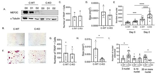 To determine if a change in osteoclast number was responsible for the osteopenic skeletal phenotype we observed via micro-CT, we cultured BMMs from female C-WT and C-KO mice. We did not detect any significant difference in the number of TRAP-positive cells on Day 2 or Day 4 of RANKL treatment, indicating that the number of osteoclasts did not differ between WT and C-KO mice (Figure 2B,C,F,G). Similarly, we did not detect any decrease in cell number via the DAPI staining of cell cultures from C-KO mice at either Day 0 or Day 2 compared to C-WT mice (Figure 2E, p ≤ 0.001 and p ≤ 0.0001). However, when comparing the size of osteoclasts, C-KO osteoclasts were smaller than C-WT osteoclasts after 4 days of RANKL treatment regardless of whether the cells were isolated from male or female mice (Figure 2H and Supplementary Materials Figure S2A, p ≤ 0.05). The number of osteoclasts with three nuclei were significantly higher in the TRAP-positive cells from the C-KO mice; however, there were no detectable cells with 20 or more nuclei as seen in the cultures from the C-WT mice (Figure 2I, p ≤ 0.05). Lastly, we also determined the expression of genes involved in osteoclast differentiation. We measured the significant downregulation of all of the genes tested, suggesting that the loss of MEF2C expression may regulate osteoclast differentiation at early stages through the expression of c-fos and c-jun (Figure 3).
