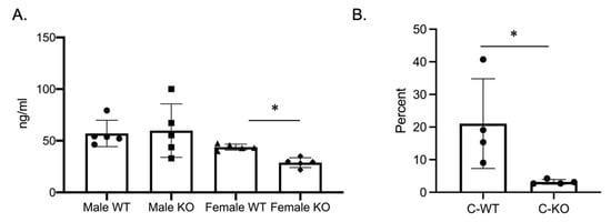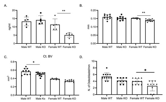 As the osteoclast phenotype did not explain the skeletal phenotype, we determined bone formation through a P1NP ELISA. P1NP, a marker of bone formation, was significantly decreased in female C-KO mice (Figure 6A). With the decrease in P1NP, we measured cortical thickness and cortical bone volume via micro-CT. Micro-CT analysis revealed a significant decrease in cross-sectional thickness in female C-KO mice but not in cortical bone volume (Figure 6B,C, Supplementary Materials Figure S3). Numbers of osteoblasts were determined via analyzing hematoxylin and eosin (H and E)-stained sections of femurs from C-WT and C-KO mice. There was a reduction in the number of osteoblasts in femurs from female C-KO mice compared to female C-WT mice (Figure 6D, Supplementary Materials Figures S4 and S5).