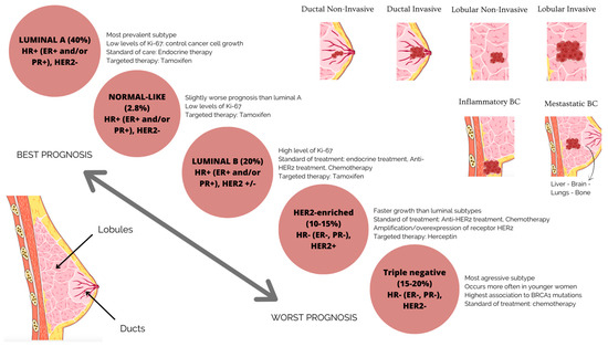 Numerous studies have demonstrated the importance of defining BC’s molecular subtypes, well known for its heterogeneity in molecular properties and cellular makeup, in the diagnosis, treatment and prognosis of the disease [5,6,7], as well as in different therapeutic responses [8]. Shorter overall survival and disease-free survival are related to tumor heterogeneity, with the expression of hormone receptors, such as the human epidermal receptor 2 (HER2+), progesterone receptors (PR+) and estrogen receptors (ER+), determining the molecular subtypes of BC (Figure 1) [9,10].
