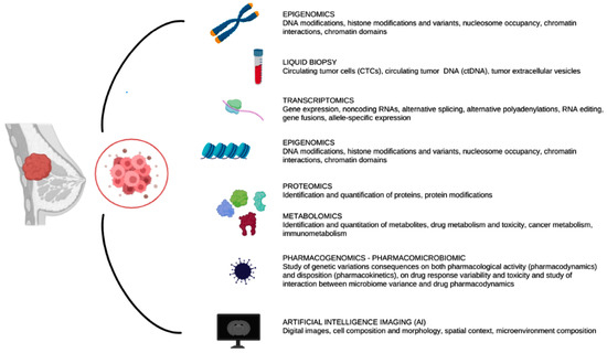 Genomic alterations could also cause changes in metabolic profiles, and these changes eventually could facilitate cancer development [14]. Without ignoring the information offered by genetics, biomarkers can be discovered by examining drug metabolism, including immunometabolism and its connection with the microbiota. Cancer can be considered a metabolic disease brought about by genetic or non-genetic signaling and metabolic abnormalities, with hypoxia, inflammation and changes in metabolism being drivers of carcinogenesis [125]. In fact, since metabolite formation is sensitive to both internal and external stimuli, the metabolome offers the potential to serve as a biological phenotypic probe that can shed light on what occurs in cells [126]. According to recent studies, tumor cells can alter the intracellular metabolism to meet the needs of unchecked proliferation, and the early detection and monitoring of cancer can be performed by detecting aberrant metabolic phenotypes [127]. Metabolomics analysis has been used in BC as an approach to discovering potential pharmacological susceptibility to therapies, such as the antitumor activities of sulforaphane (SFN) in BC patients [77], or to target metabolic limitations [128,129,130].