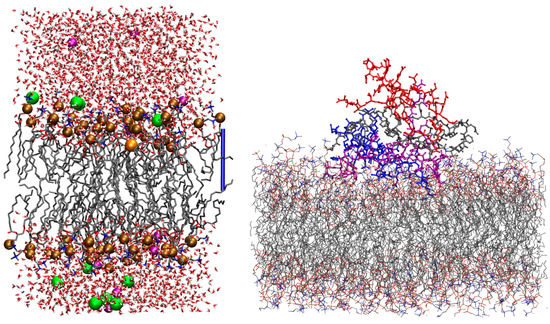 (Left) one configuration of the Na+/DMPC system obtained by MD, where the Na+ cation is deep in the bilayer interface. The ions of interest are represented as spheres, while other components are represented as sticks. C atoms are gray, N blue, P bronze, O red, H white, K purple, and Cl green. The hydrogen atoms of water molecules are displayed, while those in DMPC are omitted for clarity. The addressed cation is the orange sphere. The atomic and bond radii are arbitrary. The bar on the right-hand side shows the z axis as a ruler of length 17 Å. VMD [54] is used for molecular drawings. (Right) one configuration of A tetramer displaying a large interaction with DMPC (R = 0.1), model 1 (no Cu loaded). A monomers are A (red), B (purple), C (blue), and D (gray). Hydrogen atoms, water molecules, and ions are not displayed.