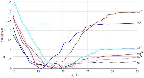 The monovalent cation, Na+, is distributed as an ionic atmosphere, since the work to unbind the cation is lower than . This is also evident by measuring, in conventional MD (cMD, hereafter), the minimal distance between the cation and atoms in DMPC (see Figure S1 in the Supplementary Data, SD). Furthermore, the Fe and Mg divalent cations are weakly bound to DMPC. By inspecting the configurations around the F minimum (see also next subsection), the two cations do not lose most of the water molecules in the first-shell hydration sphere. The Ca cation is the one with the position of the F minimum below the bilayer average width (the vertical line in the figure). Since the width is measured as the average distance projected along z (the bilayer normal), the position of minimal F for Ca is deeper than the phosphate groups in the lipid bilayer. Na, Fe, Mg, and Zn display an increase in energy upon desorption from the bilayer that is about , while Ca and Cu display a much larger energy change. This shows that Ca and Cu are strongly absorbed over the bilayer surface, while the other cations behave like mobile cations, either as free ions (Na+) or hydrated ions (Fe2+, Mg2+, Zn2+). Fe and Zn behave similarly to Mg, showing that all of these ions strongly interact with water molecules.