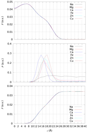 Ca and Cu have a similar desorption curve, but Ca is able to penetrate deeper into the bilayer. However, the depth of Cu penetration is significant, showing that reactions catalyzed by Cu are potentially more effective than those catalyzed by Fe. Cu is the ion most similar to Ca, and this similarity occurs because Cu is less hydrophilic than all the other ions. The number of water molecules bound to Cu are less than for Mg, Zn, and Fe, mainly because of the force-field that parametrically fits the known coordination number of the ions when in a water solution [51].
