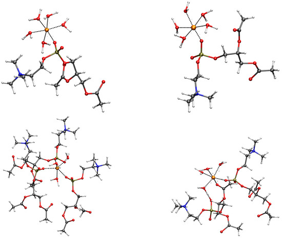 Configurations contributing to the minimum of free energy displayed in Figure 2. Only atoms and residues belonging to the first-coordination sphere of the addressed cation are displayed. The long acyl chains of DMPC are replaced with acetyl groups, as in the following DFT geometry relaxation (see Figure 5). The distances of the first-shell coordination are drawn as black dashed lines. The addressed cations are orange spheres: Mg (top-left); Zn (top-right); Ca (bottom-left); Cu (bottom-right). C is gray; O is red; N is blue; P is bronze; H is white. The atomic and bond radii are arbitrary.