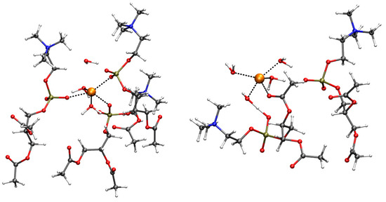 The minimal energy configurations of Ca (left) and Cu (right) binding sites, obtained starting from the configurations contributing to the minimum of free energy displayed in Figure 2 (Figure 4). Three different phosphatidyl choline (PC) headgroups are assembled around Ca (left). Cu is coordinated with OC and four water molecules, with two phosphatidyl choline headgroups assembled via intercalated Cu-bound water molecules. The long acyl chains of DMPC are replaced with acetyl groups. The distances in the first-coordination sphere of the addressed cation are drawn as black dashed lines. Ca (left) and Cu (right) are orange spheres; C is gray; O is red; N is blue; P is bronze; H is white. The atomic and bond radii are arbitrary.