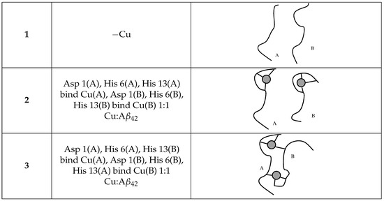 The simulation of the formation of the Cu-A complex by using the recently proposed divalent-cation model [51] is very challenging, because of the importance of soft interactions such as those between Cu/Fe and His sidechains. Therefore, in this work, we describe the models of the reactant pre-formed A oligomers (model 1) and our proposal of the product Cu-A complex (models 2 and 3, see also Figure 6).