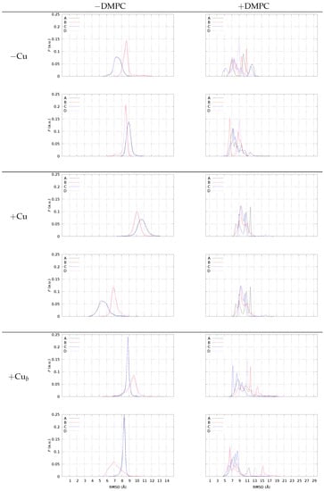 The extent of spreading for the RMSD distribution of monomers when DMPC is added to the sample is an indication of the degree of interaction: when the distribution of RMSD is uni- or bi-modal, the monomer is farther from DMPC, and it is embedded into an environment similar to the water solution. Conversely, when the distribution becomes flatter for a monomer, the monomer is more involved in interactions with DMPC, an environment that is anisotropic and heterogeneous. For instance, with no Cu monomers, A and C interact with the bilayer surface. When Cu is bridging two monomers into dimers, we notice that for all of the monomers, the distribution displays several peaks rather than a broad distribution. Since, in the latter case, the number of contacts with DMPC is smaller, we argue that the smaller the number of contacts with DMPC, the more defined the structure of monomers within the tetramer.