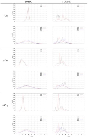 The distribution P of distance d between N(Asp 1) and C (Ala 42) belonging to different pairs of monomers (A–B, …). Left panels—tetramers ( 0.98) in the water solution; right panels—tetramers (all configurations) with DMPC. Model 1 (−Cu); model 2 (+Cu); model 3 (+Cu). Top in each frame—distances within pre-formed dimers; bottom in each frame—distances between monomers in different pre-formed dimers.