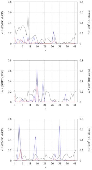 Average number of contacts c between different sets of atoms in DMPC molecules and any atom in each residue r. c is counted one when a single atom of residue r has distance 4 Å from any of the atoms in the selected group of DMPC atoms. Black line (left y-axis)—any atom in DMPC; red line (left y-axis)—phosphoryl OP atoms in DMPC; blue line (right y-axis)—carbonyl OC atoms in DMPC. (top)—model 1 (2 × [2 × [A]]; (middle)—model 2 (2 × [2 × [Cu-A]]; (bottom)—model 3 (2 × [[Cu-A]].