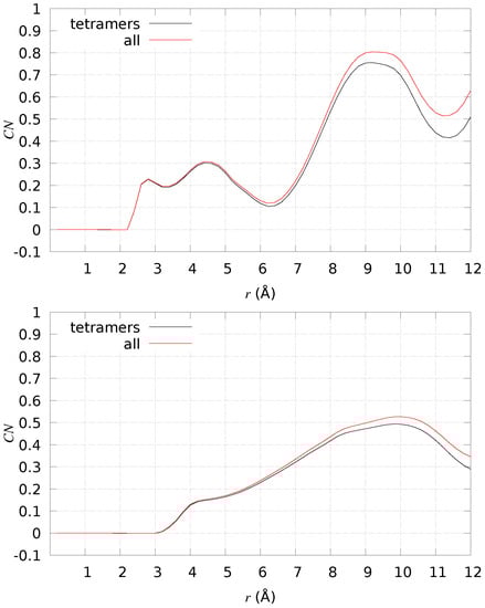 The difference in average number of particles () at distance r for different sets of atomic pairs in A. The difference is between 2 × [2 × [A]] close to DMPC (+DMPC) and the same system in the water solution (−DMPC). Top panel—N1/N2(His), all monomers, all possible pairs; bottom panel—C(Glu 22)/C(Asp 23)/C(Ala 42) on one side and N(Lys 28)/N(Asp 1) on the other side, all monomers, all possible pairs. Black curve—counting all configurations of model 1 in water; red curve—counting only tetramers ( 0.98) of model 1 in water.