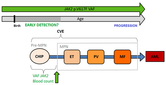 Although the presence of JAK2 mutations in the “healthy” population complicates interpretation, several studies have demonstrated the feasibility of the early identification of MPN patients via JAK2 p.V617F screening in asymptomatic individuals, even before changes in the blood count are detectable [19,103]. Perhaps it is time to change our definition of a “healthy” individual to a “pre-MPN” in the case of individuals with a low VAF JAK2 mutation [40] (Figure 1).