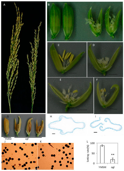 Morphological characteristics of the ogl mutant. (A) Panicle morphology of YMSM (left) and ogl (right). (B) The floret of YMSM (left) and ogl (right), bar = 2 mm. (C–F) The floret of YMSM (C) and ogl (D–F) after opening the glumes, bar = 2 mm. (G) The mature grains of YMSM and ogl, bar = 2 mm. (H,I) Transverse section from the middle of glume of YMSM (H) and ogl (I), bar = 200 μm. (J,K) I2-KI staining results of pollen grains of YMSM (J) and ogl (K), bar = 100 μm. (L) Comparison of setting rate between YMSM and ogl. Student’s t-tests were used to generate p-values. (** p < 0.01).
