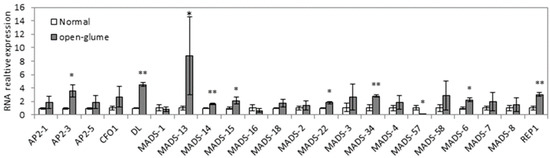 OsJAG is a key regulatory gene in the development of floral organs, indicating that there are many downstream genes regulated by it [29]. To further understand the function of OsJAG, we analyzed the expression of A/B/C/D/E-class genes in young panicles (5 mm in length) of normal plants and open-glume plants, respectively. The results showed that the expression of many genes was altered in the ogl mutant background (Figure 5), including upregulation of genes from class A (OsMADS14/15), class C (DL), class D (OsMADS13 and REP1), and class E (OsMADS6/22/34). Class B genes (OsMADS2/16) did not vary but some E-class genes (OsMADS57) were downregulated. Ap2 family genes were previously demonstrated to regulate the development of rice florets [14] and our results demonstrated the upregulation of AP2-3 in ogl. All of these results indicated that OsJAG could regulate the expression of A/B/C/D/E-class genes and AP2 genes.